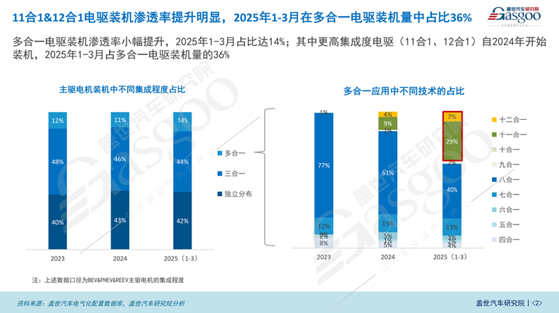 在电动汽车产业的竞技场上,一场由多合一电驱技术引发的”集成化革命”正在改写行业规则。根据权威机构数据,2025年前三月多合一电驱系统装机渗透率已达14%,其中11合1、12合1等超集成系统占比突破36%。这场技术变革不仅重塑了动力系统的物理形态,更在A0级与A级车市场开辟了全新战场。